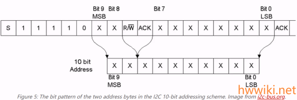 上述为常用的7为地址的读写,对于拓展的10位地址的读写,区别为前两个字节为10位地址(前缀11110表示这两个字节为10位地址),7位和10位对比如下图11)。