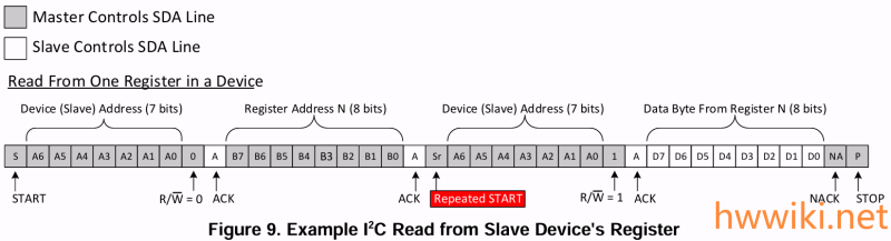 - 起始条件:时钟信号线(SCL)为高电平时,数据线(SDA)产生一个下降沿9)。