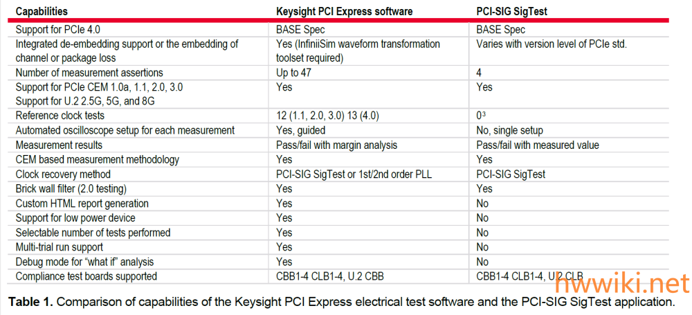 测试软件有两种,一种是由PCI标准组织提供的免费软件PCI-SIG SigTest,另一种是各仪器厂家推出的付费软件如Keysight PCI Express software。以PCIe 4.0为例,两者的对比如下,PCI-SIG SigTest免费,但功能少2) 。